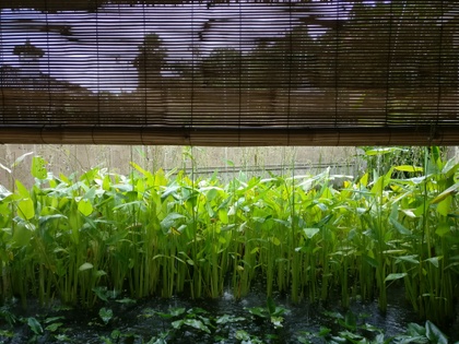 Ponds with elevated lotus leaves, frangipani trees in full bloom and palms leaves
